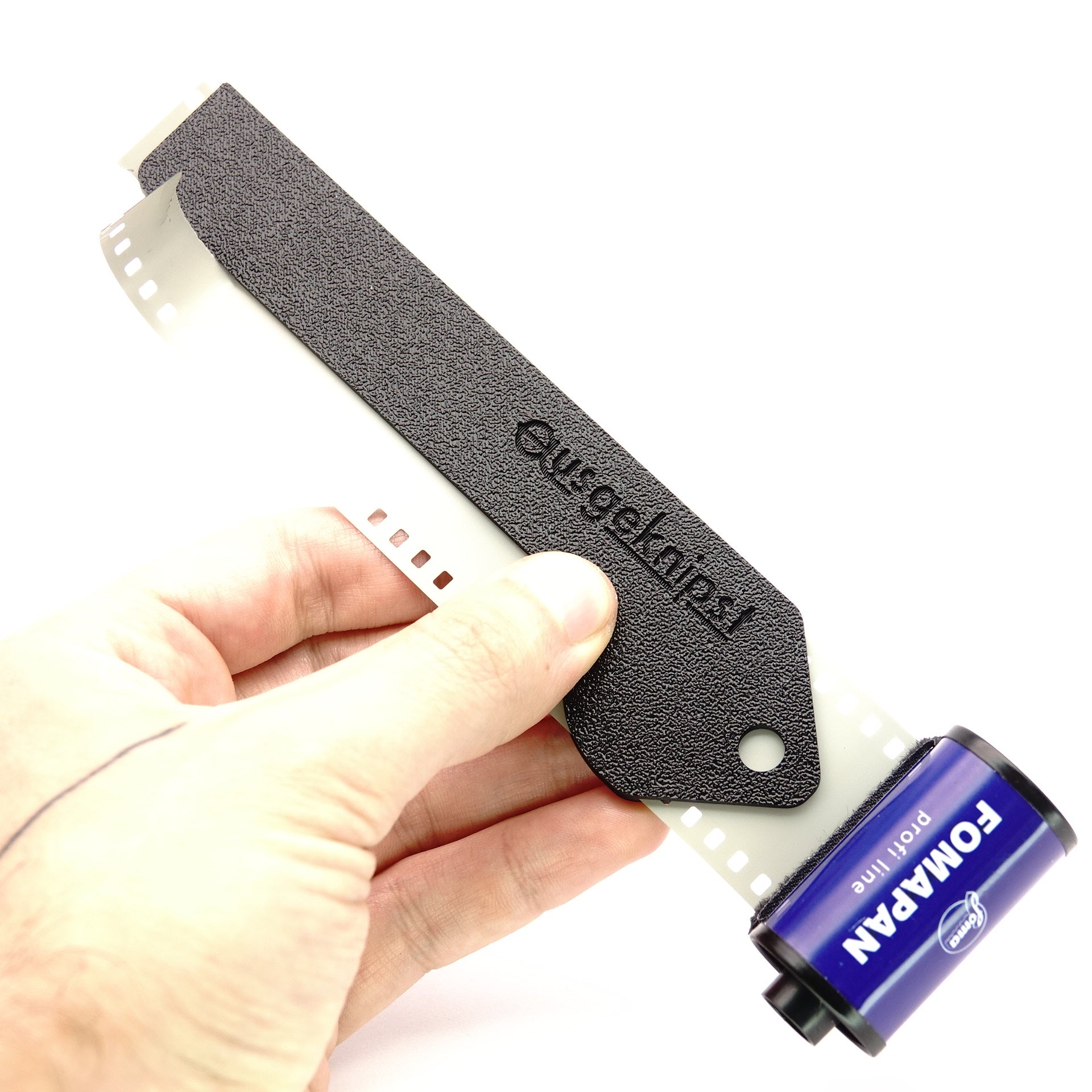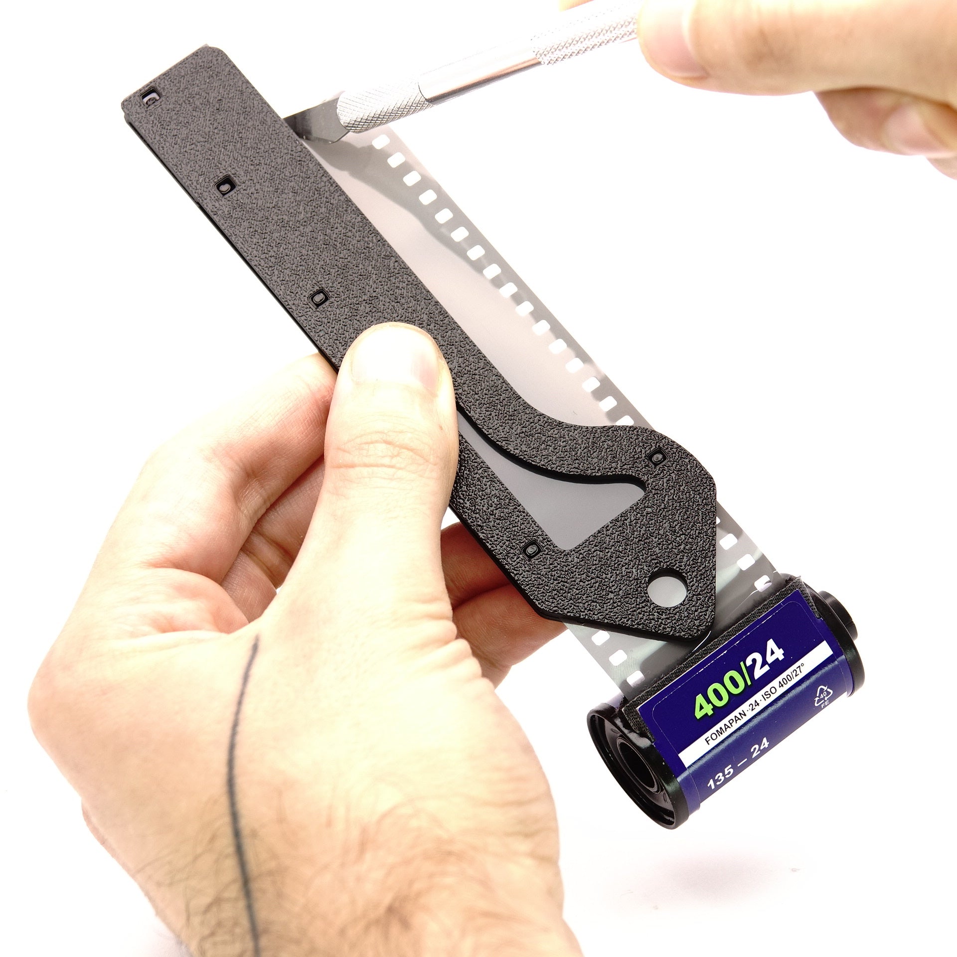 Die Schablone führt dein Messer exakt, sodass der Filmanschnitt die korrekte Form für den Transportmechanismus deiner Schraubgewinde-Kamera erhält. Bitte verwende eine scharfe, schmale Klinge (z.B. ein Skalpell) und schneide vorsichtig entlang der Führung, um den Kunststoff nicht zu beschädigen. Achte vor dem Einlegen darauf, dass keine Filmspäne am Material haften.