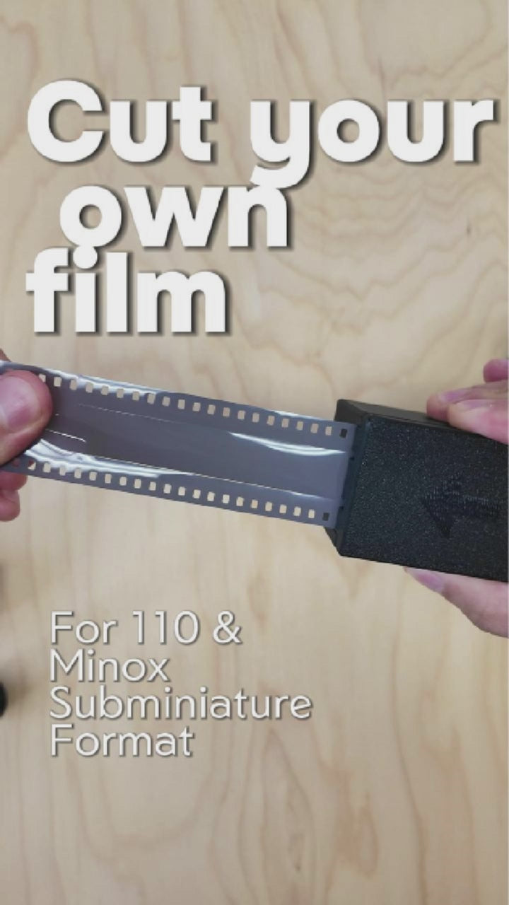 Dieser Filmschneider ist die Lösung, um deine Subminiatur-Kamera wiederzubeleben. Er ermöglicht es dir, aus günstigem und verfügbarem Standardfilm (120 oder 35mm) passgenaue Streifen für das 110er Pocket-Format oder Minox-Kameras zu schneiden.