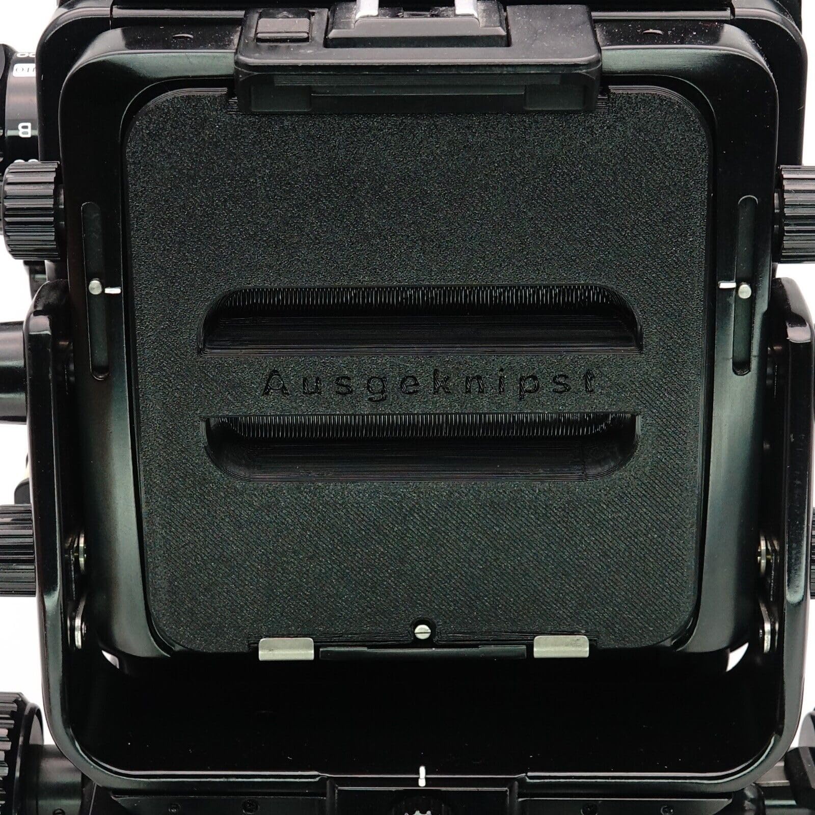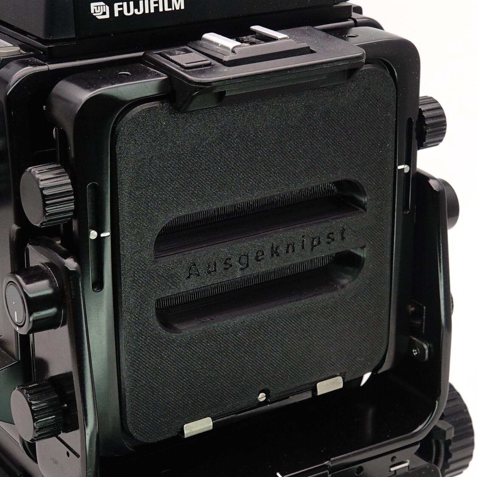 Die Fujifilm GX680 ist ein massives Werkzeug. Wenn du das Magazin abnimmst, liegt die Rückseite mit ihrer Mechanik offen. Dieser Gehäusedeckel wurde konstruiert, um genau diesen Bereich abzudecken. Er verriegelt sicher am Body und verhindert das Eindringen von Schmutz. Gefertigt aus PLA+, ist er stabil genug für den täglichen Einsatz im Studio oder on Location.