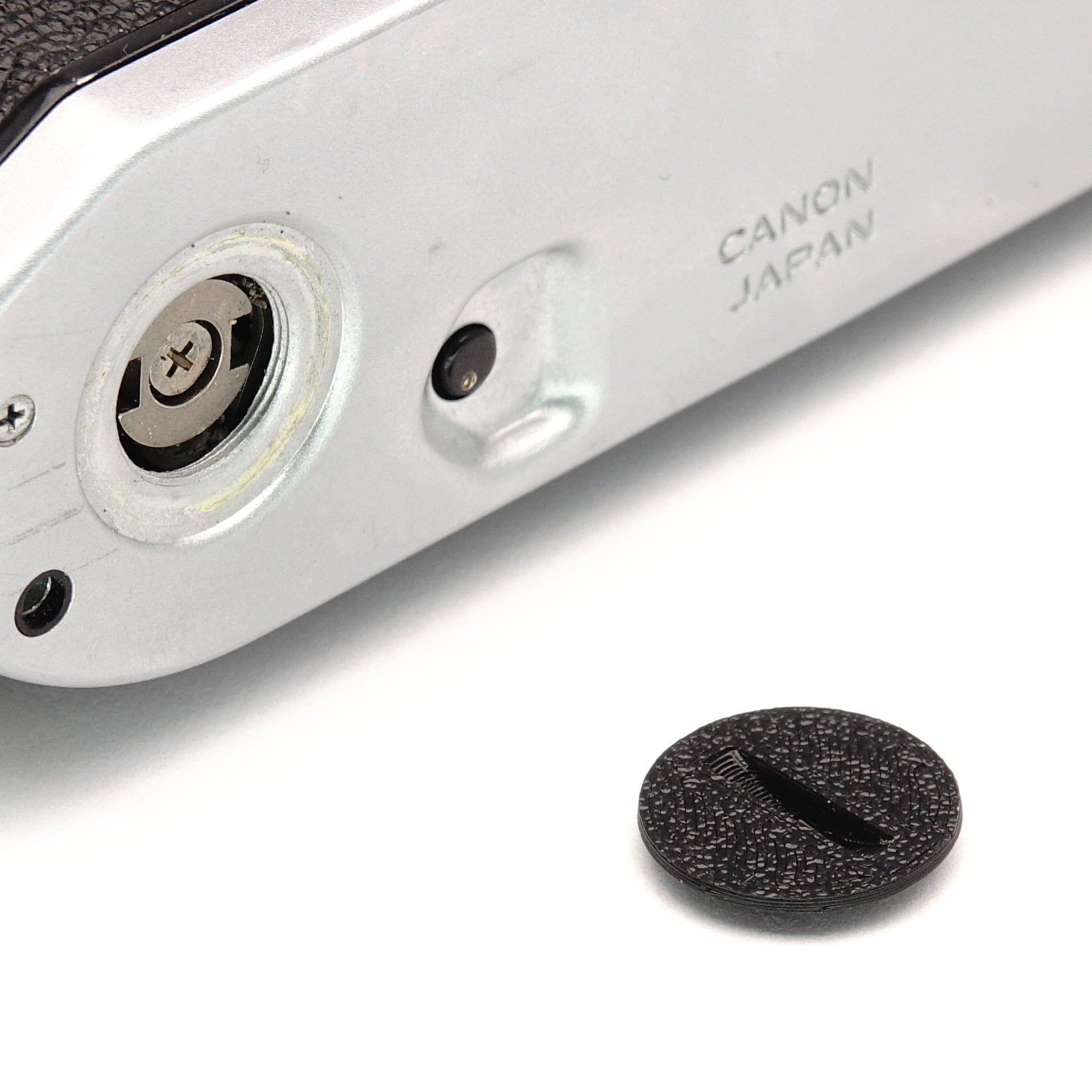 This cap replaces the frequently lost original part of the Canon A series. It is screwed into the thread at the bottom of the camera to cover the connections for the motor drive (winder) when it is not mounted. Made from sturdy PLA+.