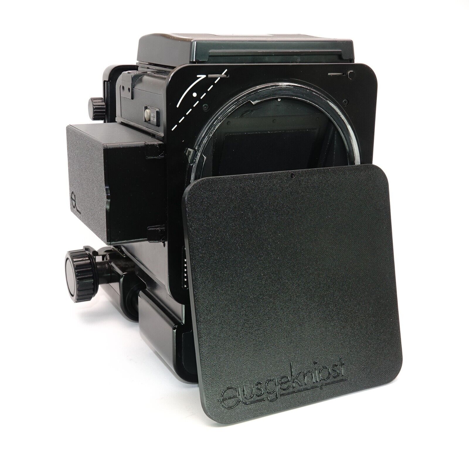 The Fujifilm GX680 is a modular system. Those who carry or store body and magazines separately know the problem of open interfaces. This back cover shields the rear of the camera body and protects the contacts and mechanism there from external influences. Made from technical plastic for daily use.