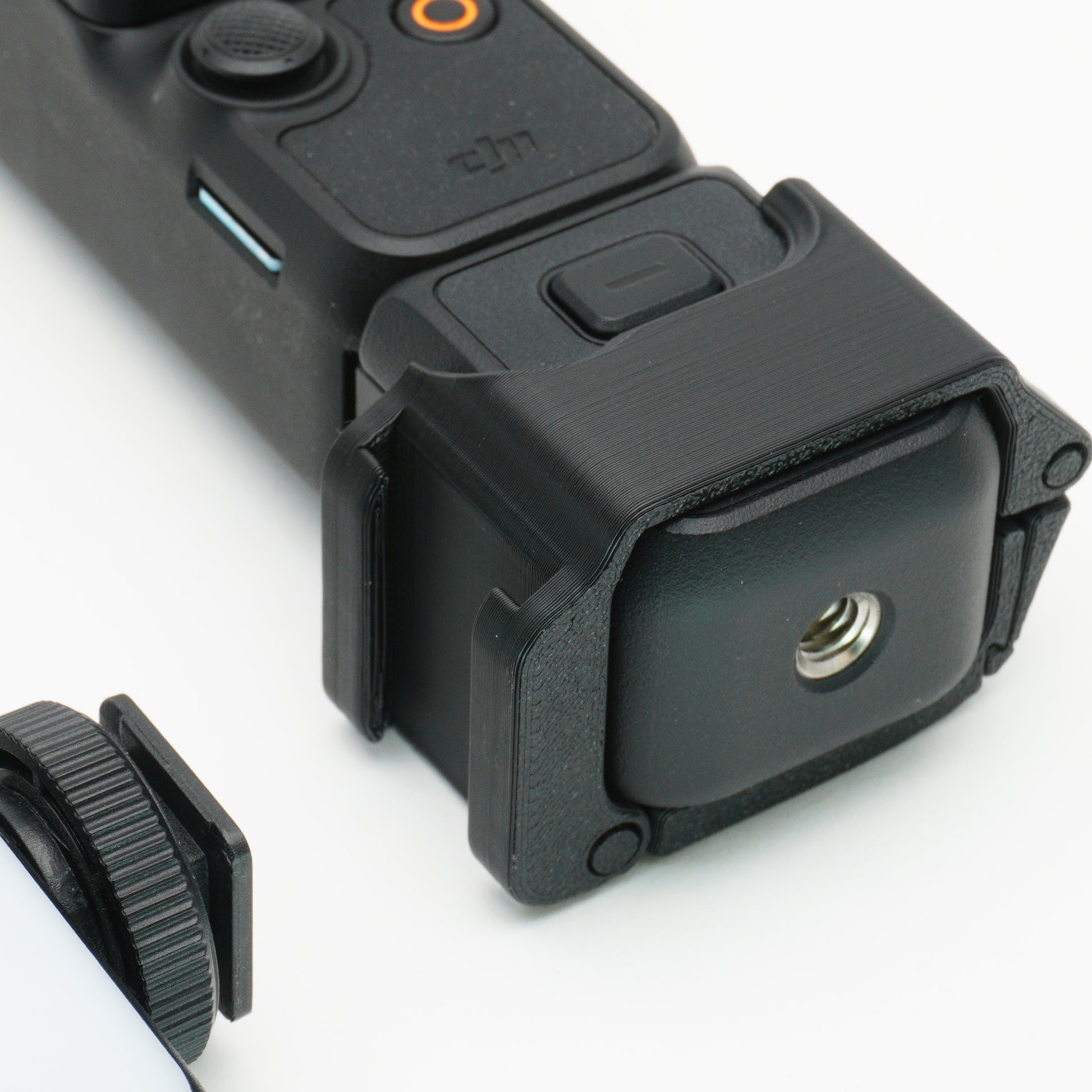 Cet adaptateur est la solution fonctionnelle pour tous ceux qui ne veulent pas renoncer au pied de trépied magnétique de la DJI Osmo Pocket 3 juste pour monter un microphone. Contrairement à l’extension standard, le dessous de la caméra reste libre. Le clip se fixe simplement et offre une prise pour les composants de griffe flash courants. Fabriqué en PLA+ robuste, il s’adapte aussi bien à la caméra nue qu’aux poignées additionnelles.