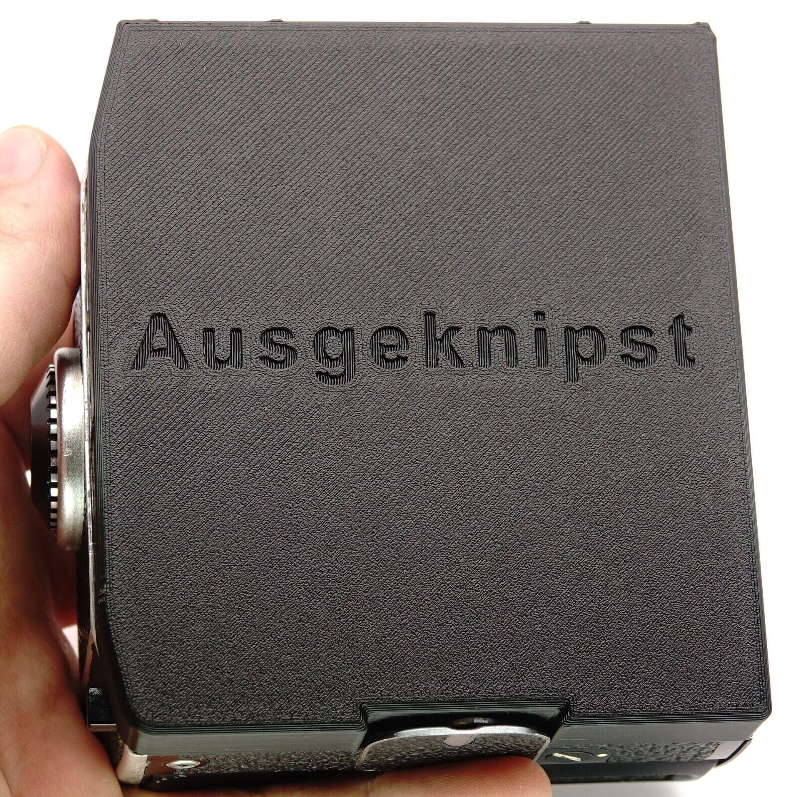 Le système d’échange du Rolleiflex SL66 est une prouesse technique, mais sans le cache de protection, le chargeur retiré est fragile. Ce cache protège le côté ouvert où la mécanique s’accouple à l’appareil. Nous avons conçu cette pièce pour qu’elle s’ajuste parfaitement et ferme le chargeur en toute sécurité. Ainsi, tu peux changer et transporter facilement des chargeurs chargés avec différents types de films.
