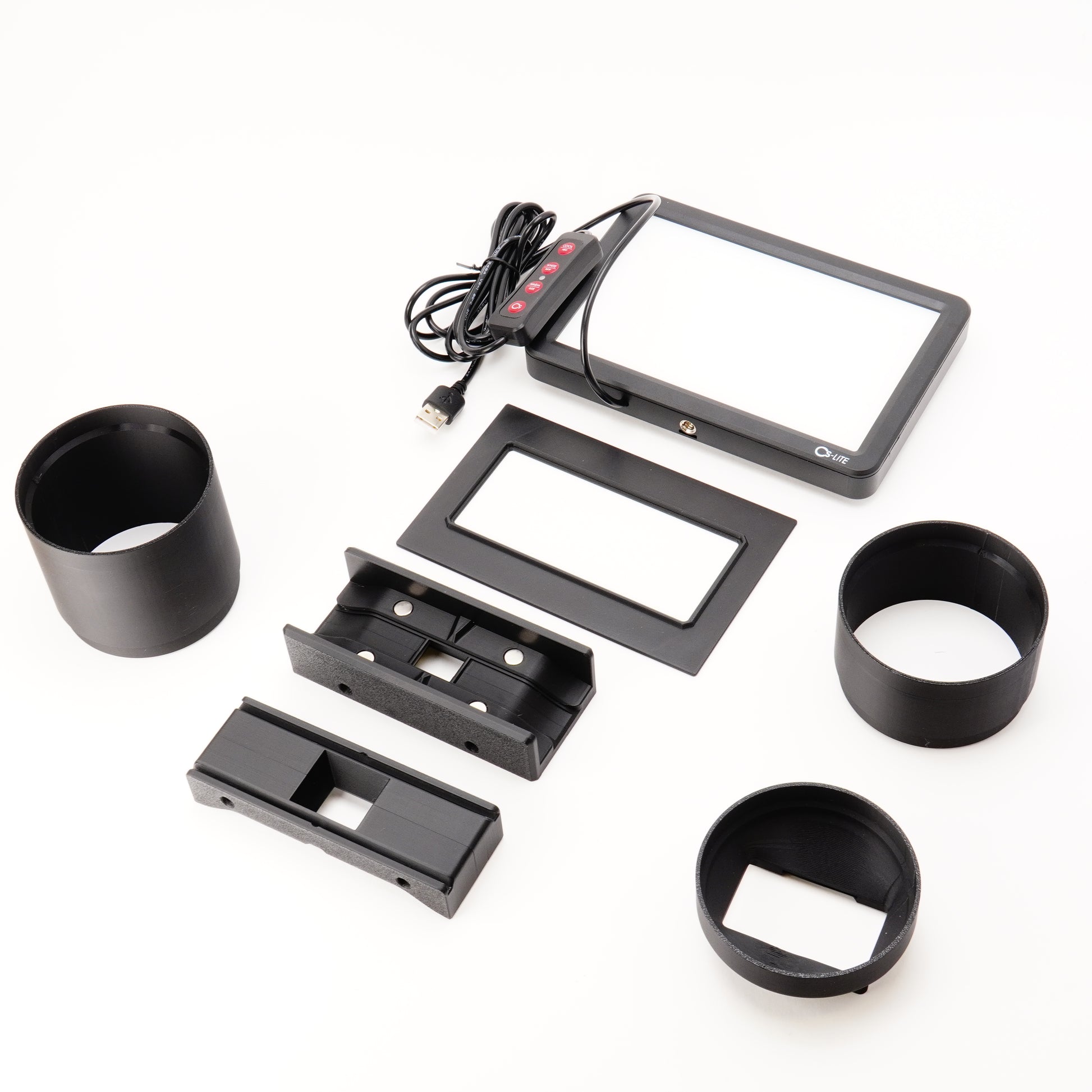 • La luce diffusa rovina le tue scansioni? Il nostro sistema a 5 strati con Adapter Plate (in basso) e paraluce (in alto) sigilla perfettamente. Nessuna luce laterale, nessuna perdita di contrasto.