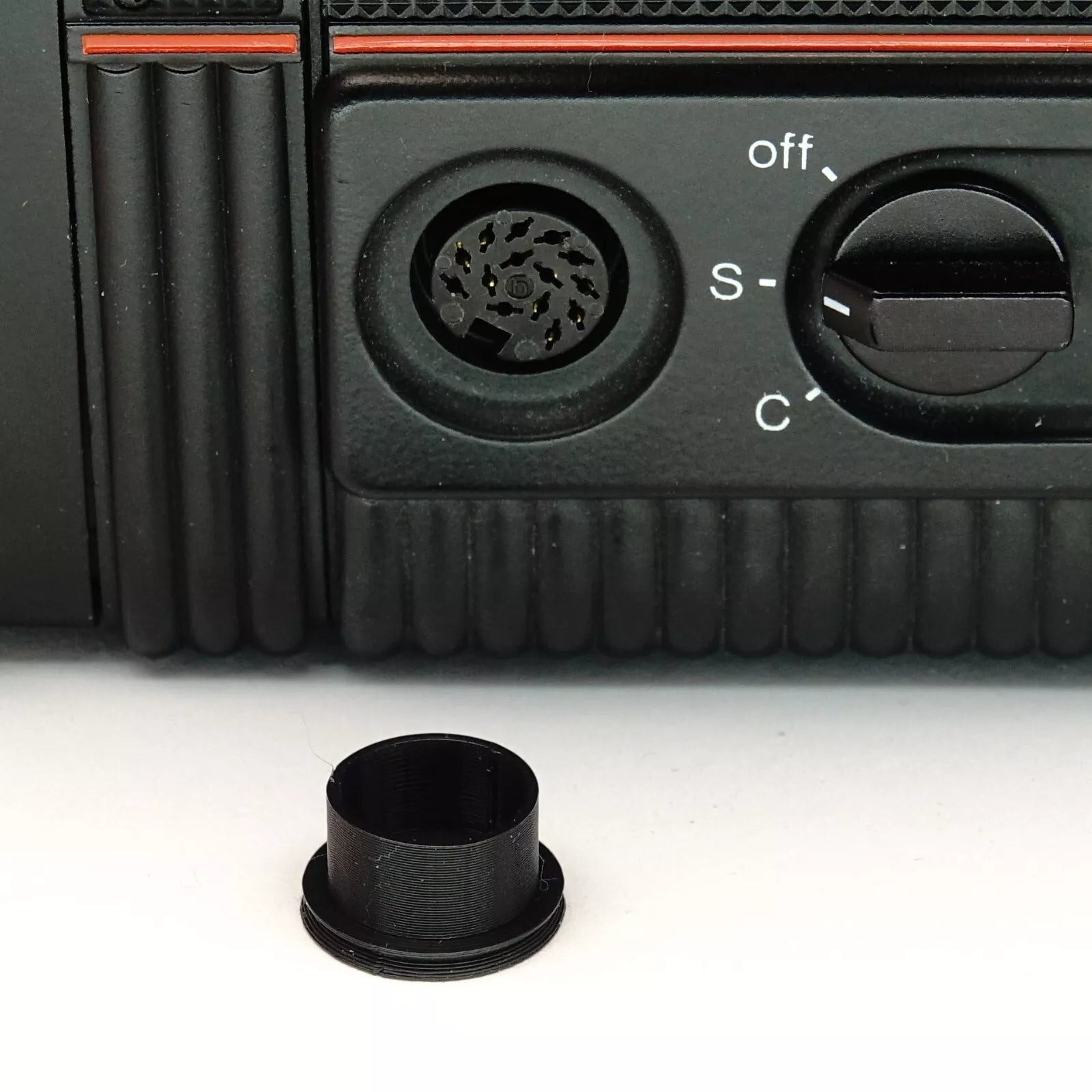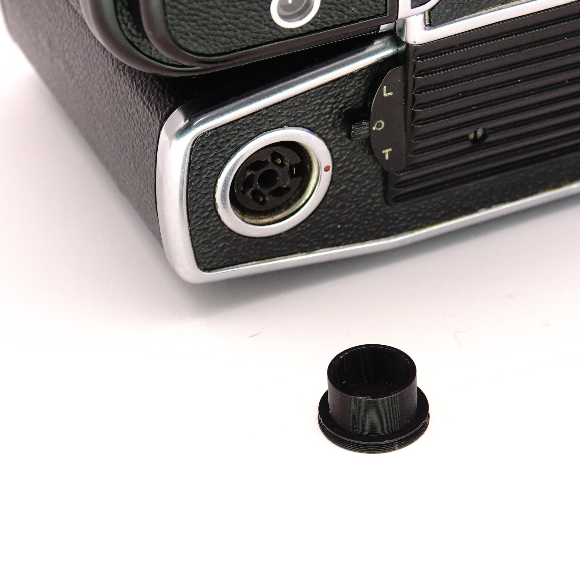 Esta cubierta reemplaza la tapa que a menudo falta para el Universal Connection Socket de la serie Rolleiflex 6000. Además, encaja perfectamente en la conexión lateral (Side Socket para exposición y carga de batería) de las cámaras motorizadas Hasselblad 500 EL (frecuentemente marcada como roja 17 en el manual). Así, tus contactos permanecen limpios y la electrónica protegida.