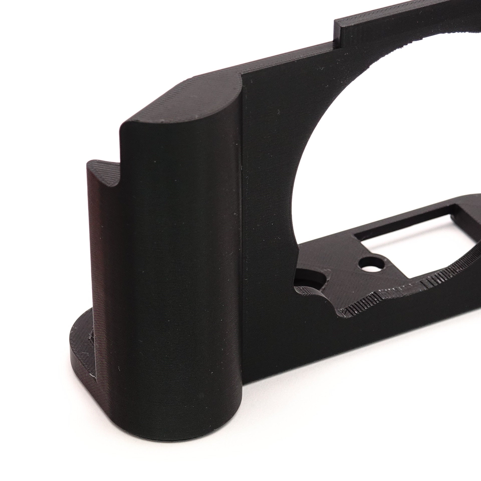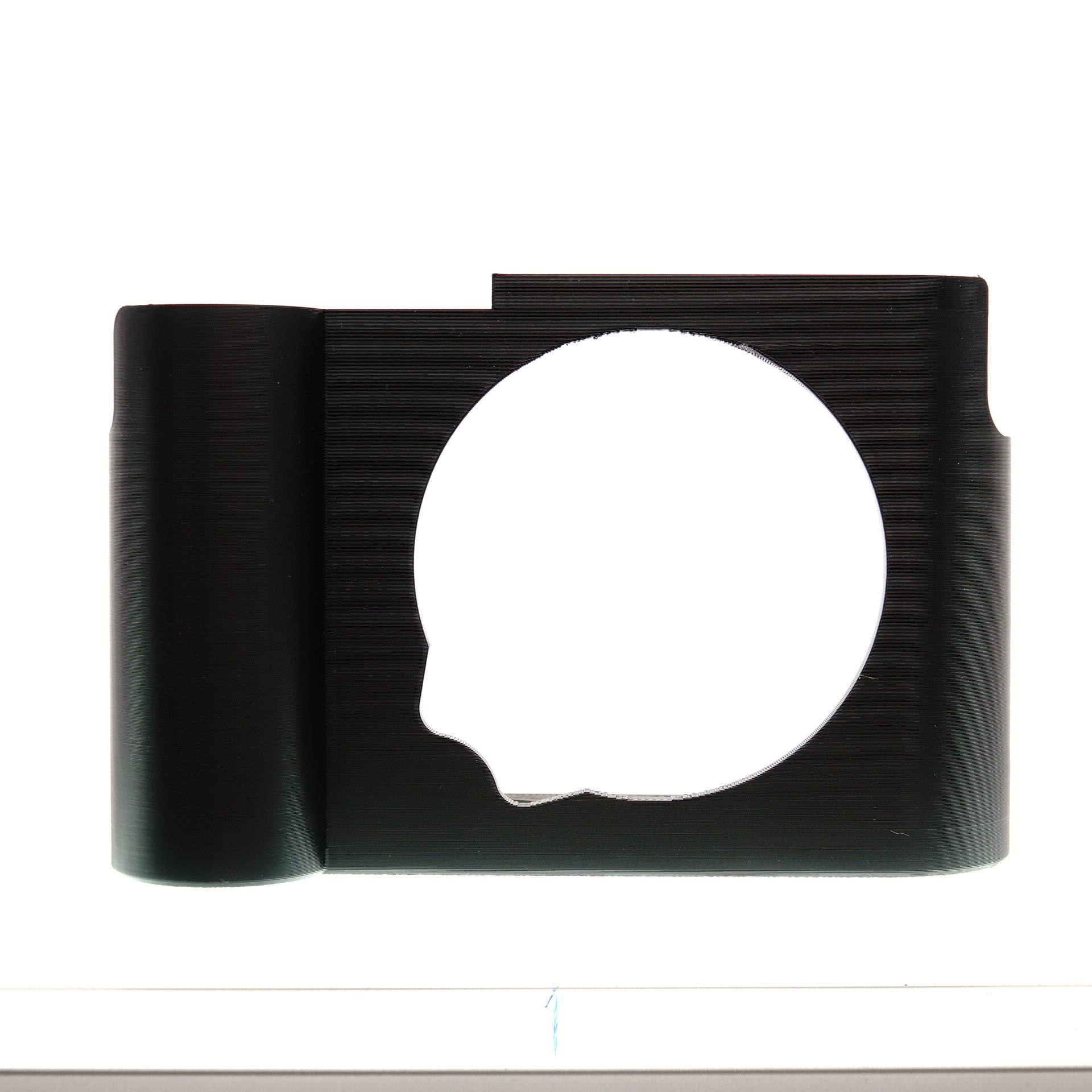 La Q3 es técnicamente excelente, pero ergonómicamente algo resbaladiza para algunas manos. Este agarre lo cambia. Mejora notablemente el manejo y, gracias a su apariencia sigilosa, aporta más discreción. Lo fabricamos con resistente PLA+ para que sea ligero y estable. Un detalle práctico: la cámara ya no se inclina sobre el objetivo cuando la apoyas. Todos los controles y compartimentos permanecen accesibles.