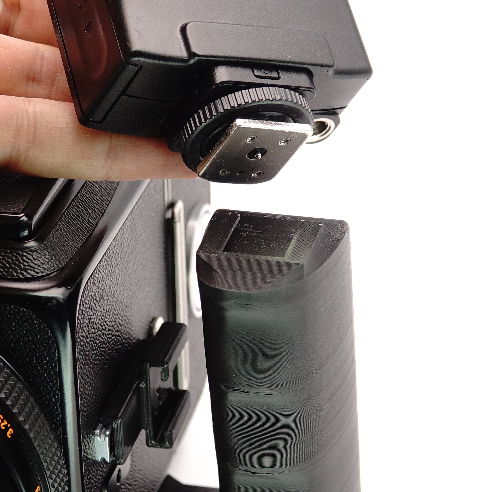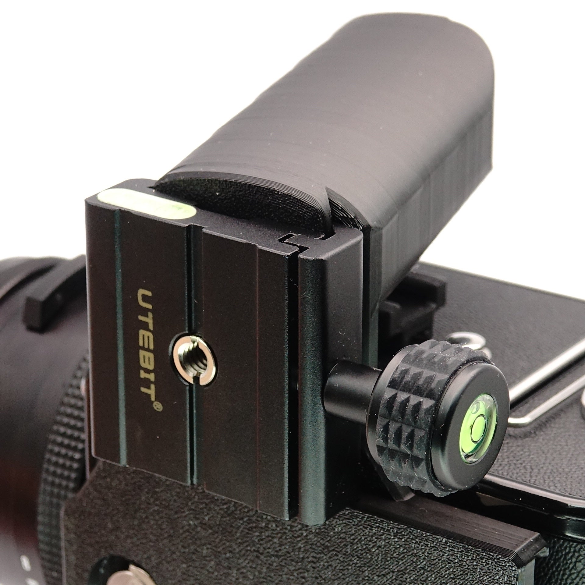 Además, es más que solo un agarre. Hemos integrado tres funciones prácticas: una montura Arca Swiss para cambios rápidos de trípode, una zapata fría para tu fotómetro o flash y – muy importante – un compartimento ajustado en la base para que tu Darkslide no se pierda en ningún lado.